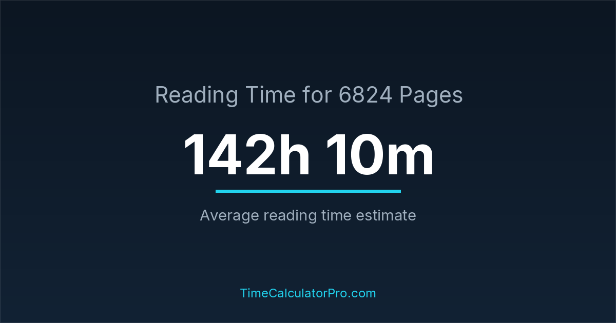 On average, reading 6824 pages may require about 142 hours and 10 minutes for most readers, assuming a standard reading pace and moderate difficulty.