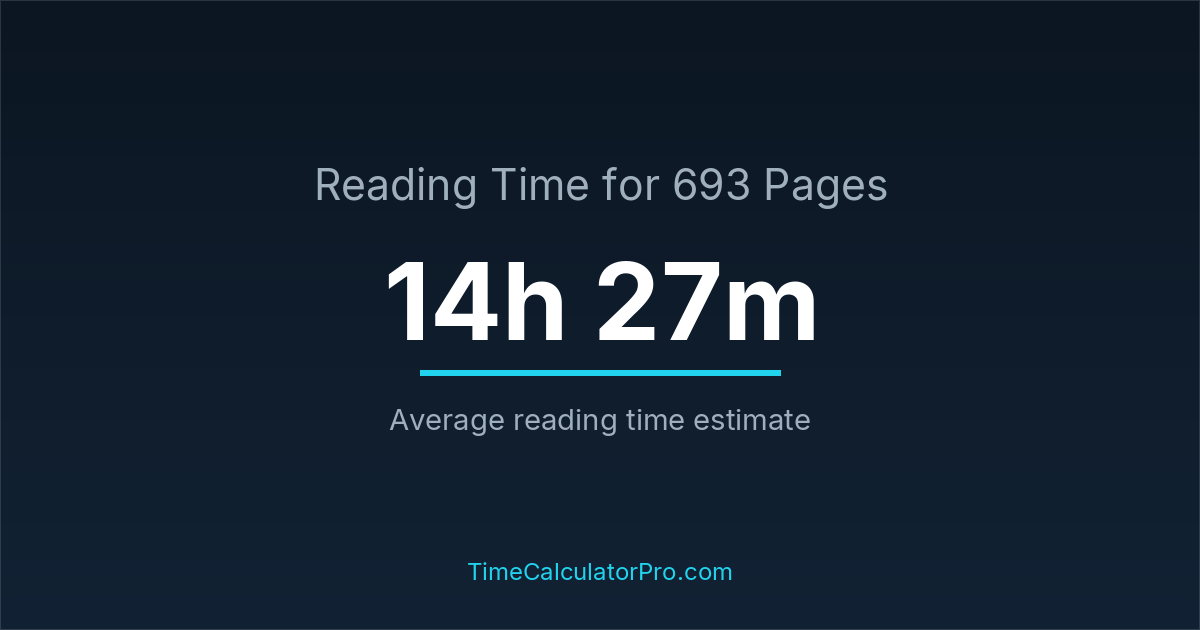 If you read at an average speed of 200 words per minute, reading 693 pages will take approximately 14 hours and 27 minutes. This estimate assumes around 250 words per page, which is typical for most books.