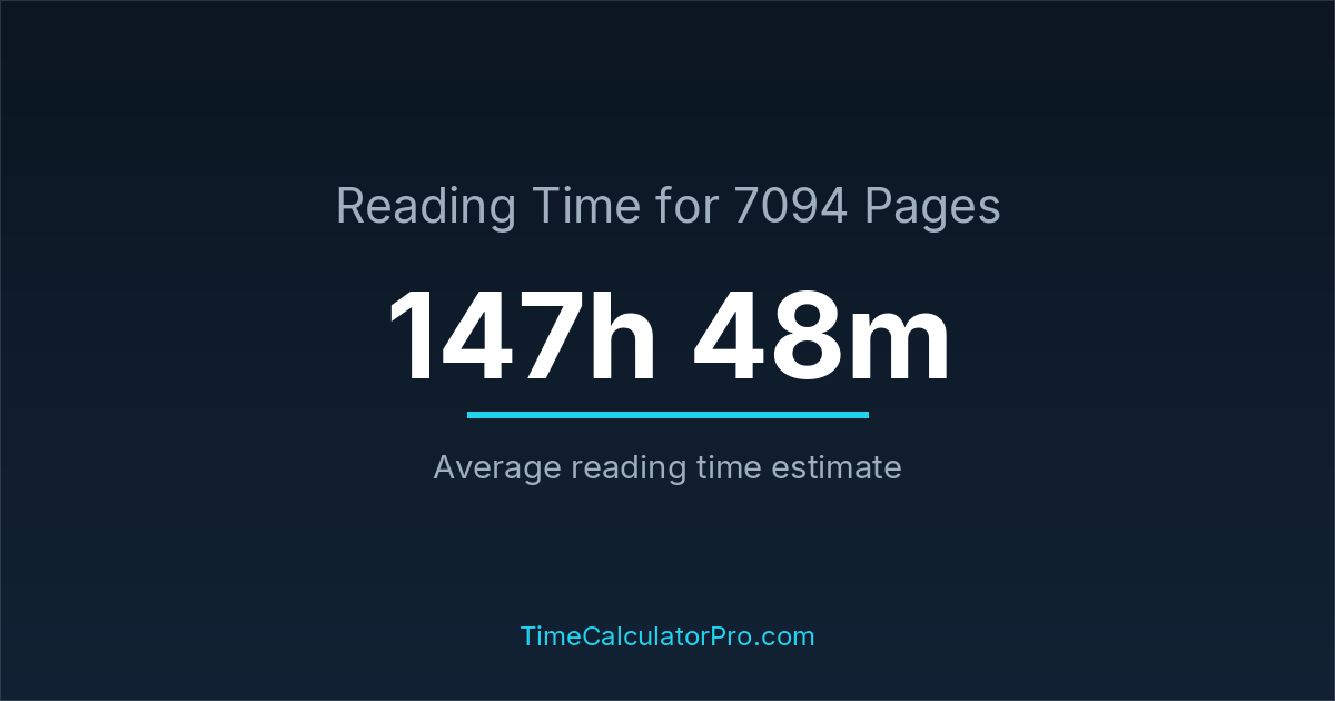 If you read at an average speed of 200 words per minute, reading 7094 pages will take approximately 147 hours and 48 minutes. This estimate assumes around 250 words per page, which is typical for most books.