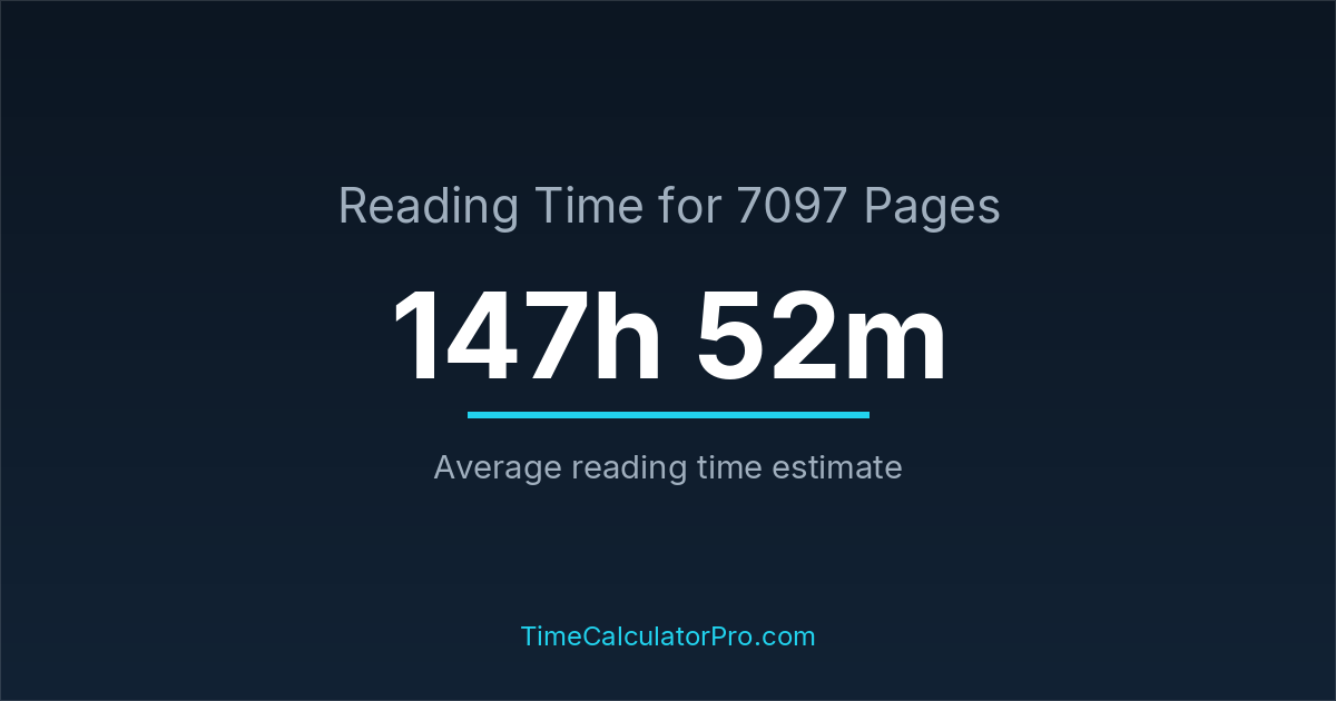 If you read at an average speed of 200 words per minute, reading 7097 pages will take approximately 147 hours and 52 minutes. This estimate assumes around 250 words per page, which is typical for most books.