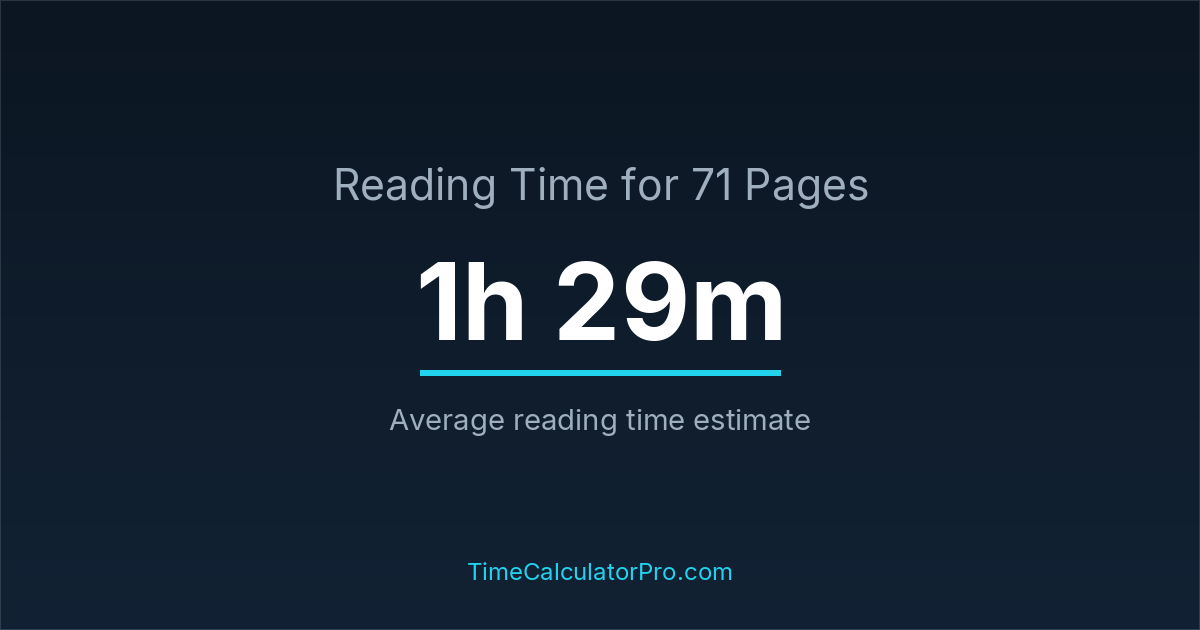 If you read at an average speed of 200 words per minute, reading 71 pages will take approximately 1 hours and 29 minutes. This estimate assumes around 250 words per page, which is typical for most books.