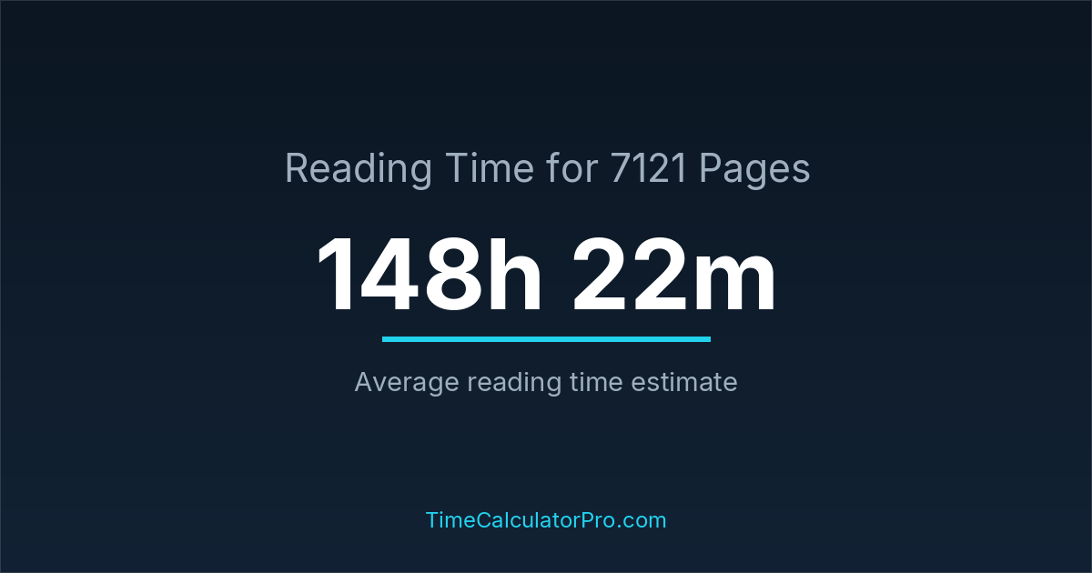 Based on standard reading speeds, reading 7121 pages would take roughly 148 hours and 22 minutes under normal conditions.