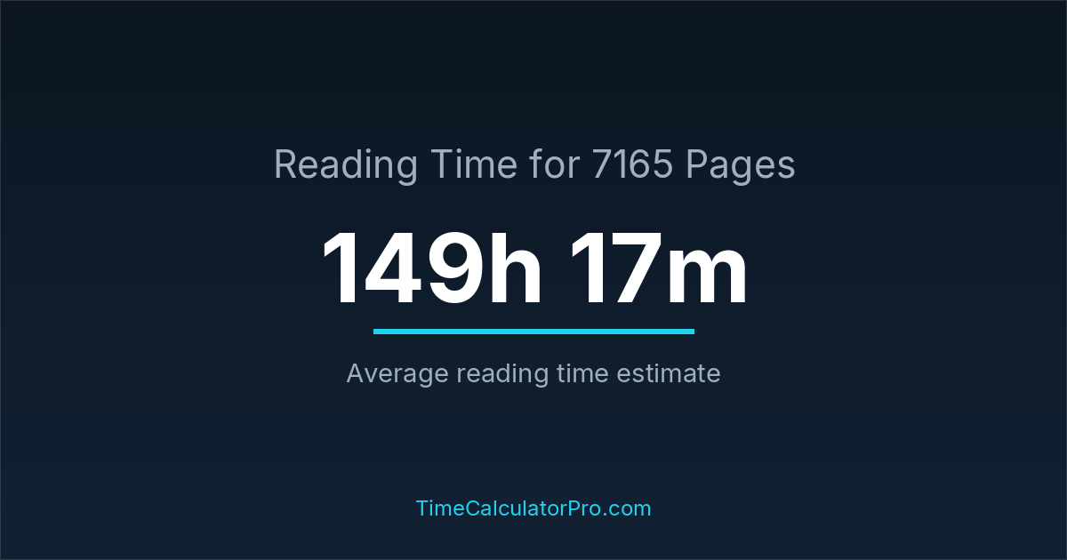 If you read at an average speed of 200 words per minute, reading 7165 pages will take approximately 149 hours and 17 minutes. This estimate assumes around 250 words per page, which is typical for most books.
