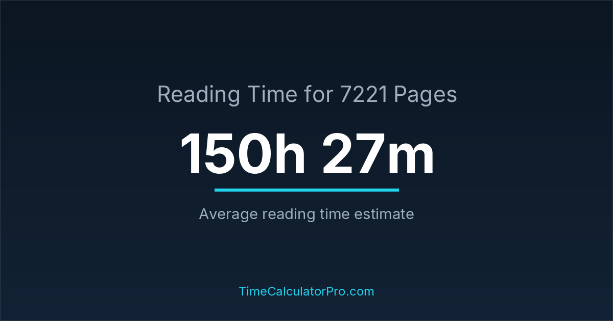 If you read at an average speed of 200 words per minute, reading 7221 pages will take approximately 150 hours and 27 minutes. This estimate assumes around 250 words per page, which is typical for most books.