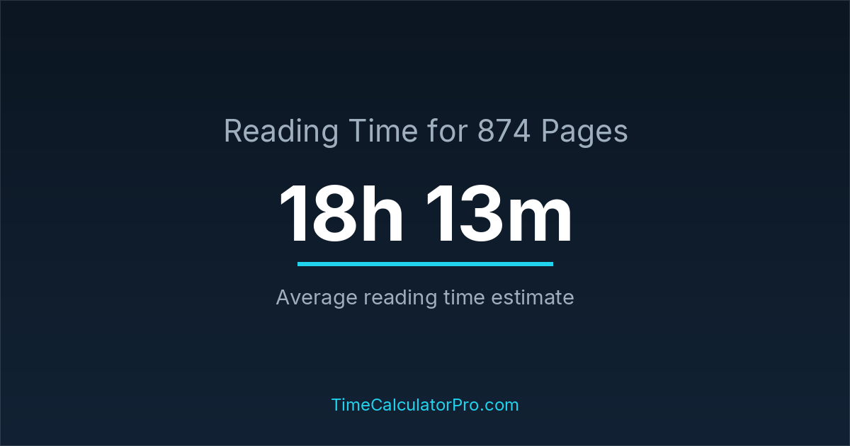 Reading 874 pages takes about 18 hours and 13 minutes.