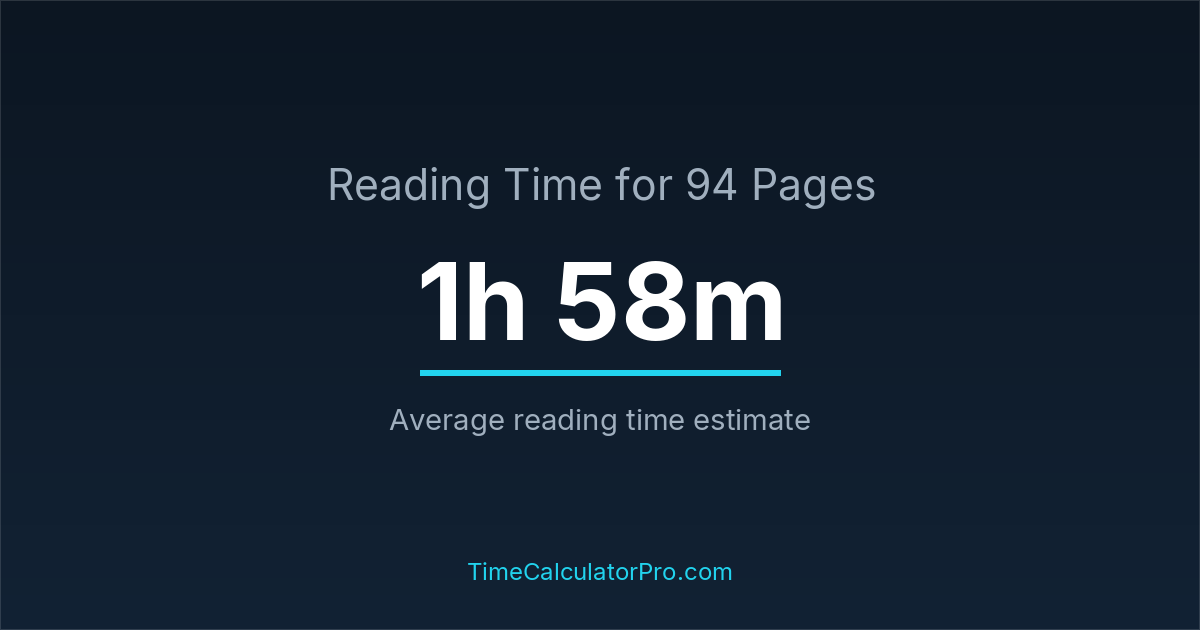 If you read at an average speed of 200 words per minute, reading 94 pages will take approximately 1 hours and 58 minutes. This estimate assumes around 250 words per page, which is typical for most books.