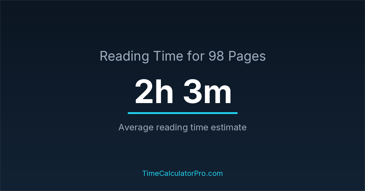 If you read at an average speed of 200 words per minute, reading 98 pages will take approximately 2 hours and 3 minutes. This estimate assumes around 250 words per page, which is typical for most books.